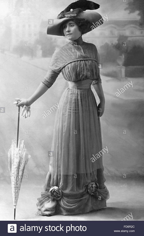 Fashion of the 1910’s was characterized by fluid, soft silhouettes, big hats, and short hair. Dress length came up from the floor to above the ankle. Often times, women wore a tunic over long skirt. Skirts were widest at the hips and became narrow at the ankle.