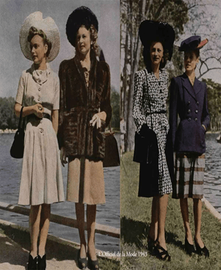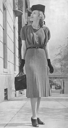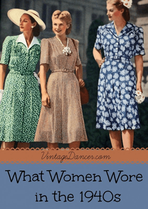 In a nutshell, 1940s women’s fashion was about creating an hourglass silhouette with masculine details: padded shoulders nipped in high waist tops, and A-line skirts that came down to the knee. This was the everyday shape for clothing, from suits to dresses. Even pants had a similar high waisted, wide leg shape.