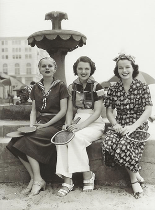 Casual sports clothes– skirt like shorts, striped knit shirts.
