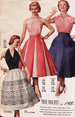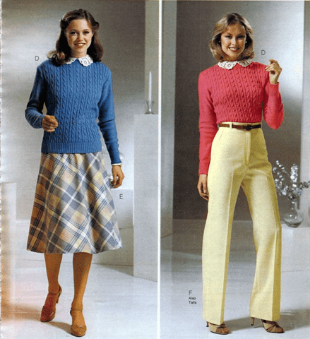 During this decade, frilly, puffed blouses and fluted skirts continued to be popular. A slightly high waistline was fashionable, as was a long tunic-like top worn over an ankle length A-line or ‘hobble’ skirt (cinched in at the hem).