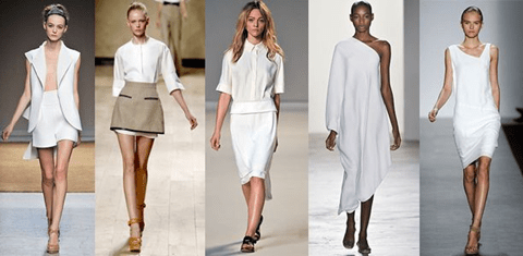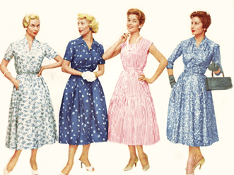 Midi length bias cut dresses, puff sleeves, belted waists and large yokes or collars.