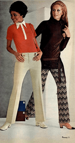 Popular early 1970s fashions for women included Tie dye shirts, Mexican ‘peasant’ blouses, folk-embroidered Hungarian blouses, ponchos, capes, and military surplus clothing. Bottom attire for women during this time included bell-bottoms, gauchos, frayed jeans, midi skirts, and ankle-length maxi dresses.