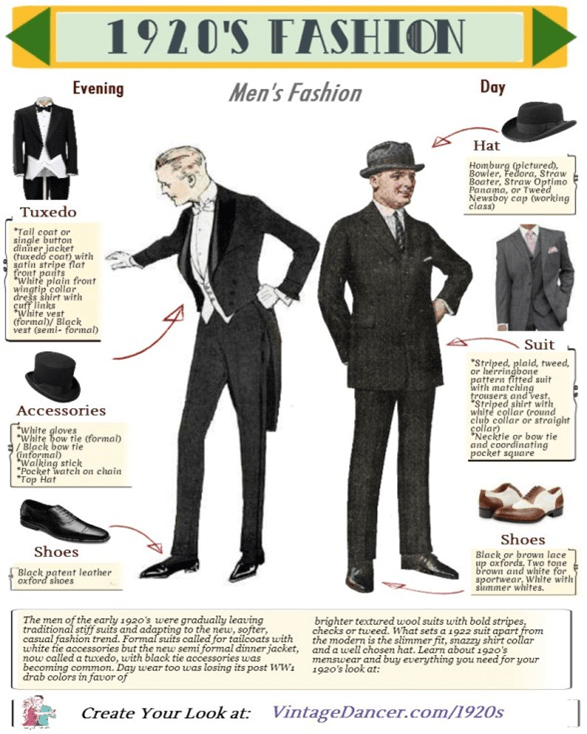 The 1920’s Fashion trends were the shorter, low-waisted dresses and revealing styles worn by the Flappers, the ‘bobbed’ hairstyles, cloche hats, the casual, haphazard fashion of a mixture of brightly colored clothes, scarves and stockings with bold, striking Art Deco geometric designs of the era.